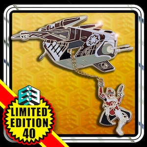 This beautiful pin is based on the 13th episode of the Mandalorian titled "The Jedi." It features the moment Ahsoka cuts the gong on the gate of Calodan. You can see the dead forest and eerie green sky from the planet Corvus. Her white lighrsaber has glitter details. This pin measures 2.5 inches long, hard enamel with nickel plating and backstamp.