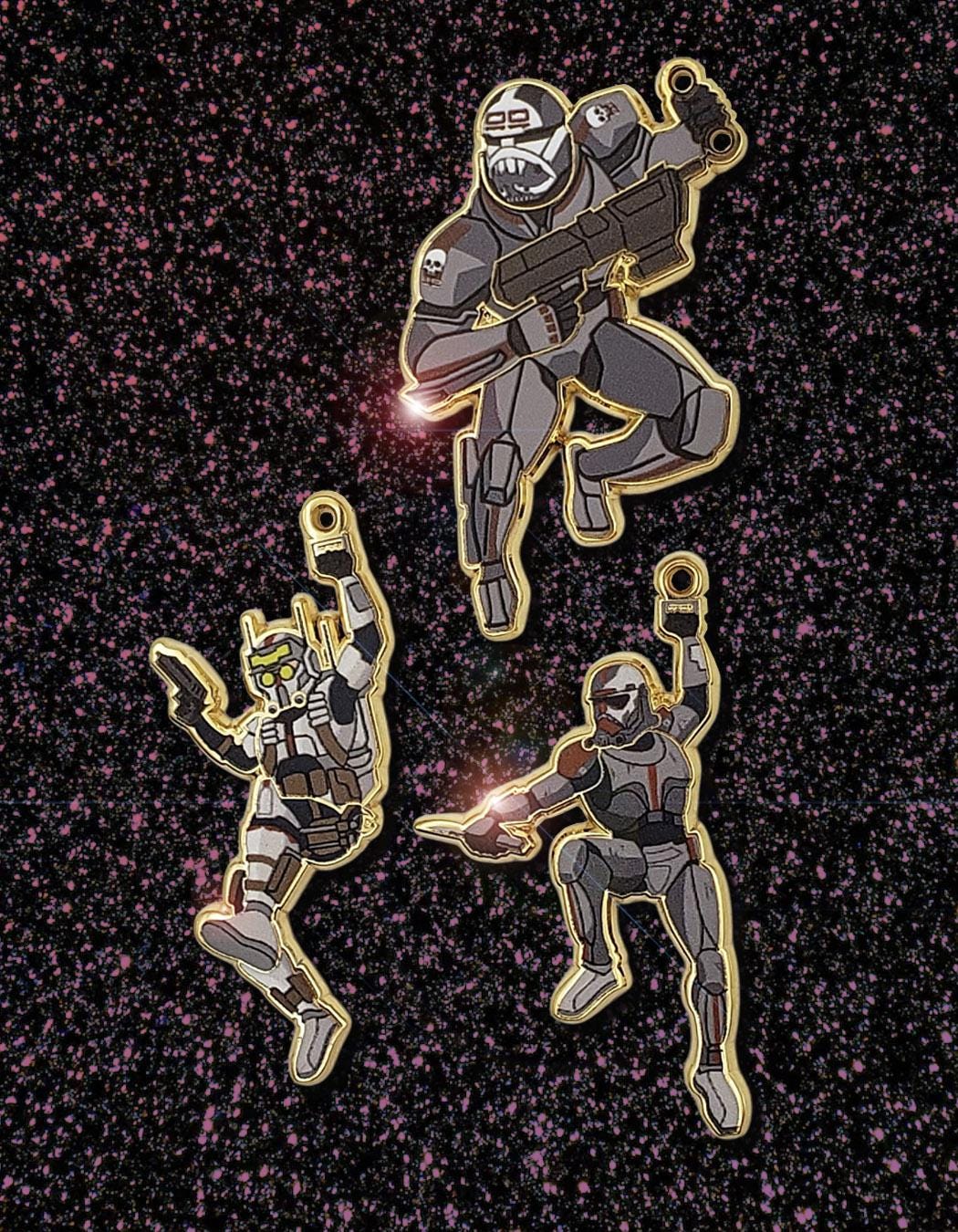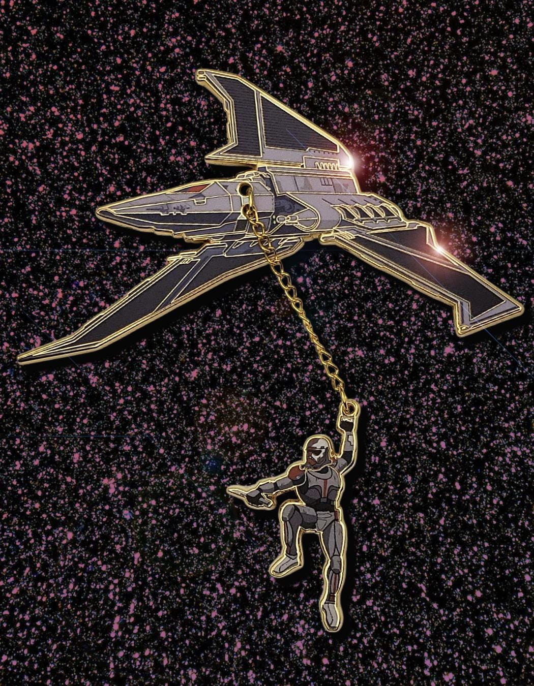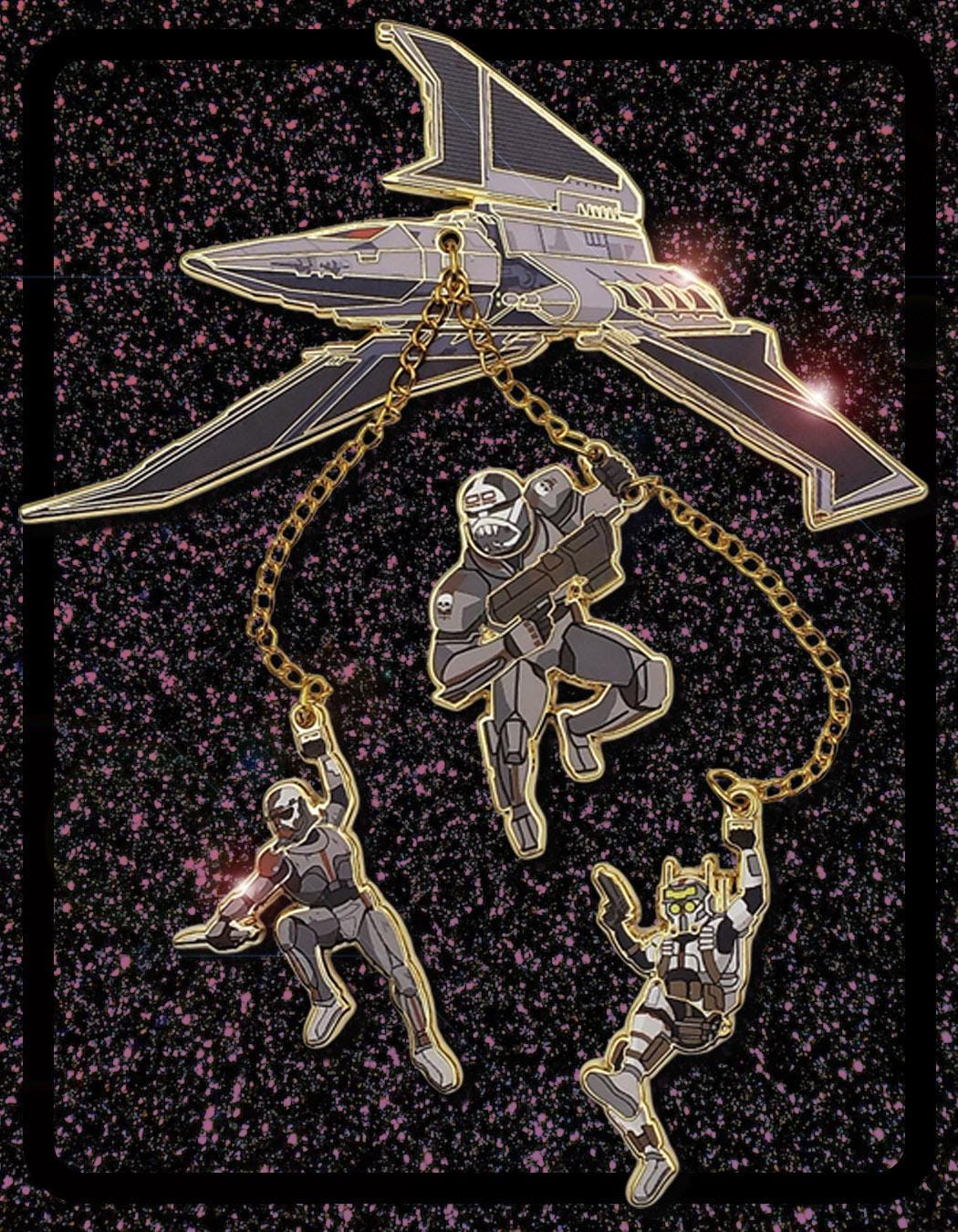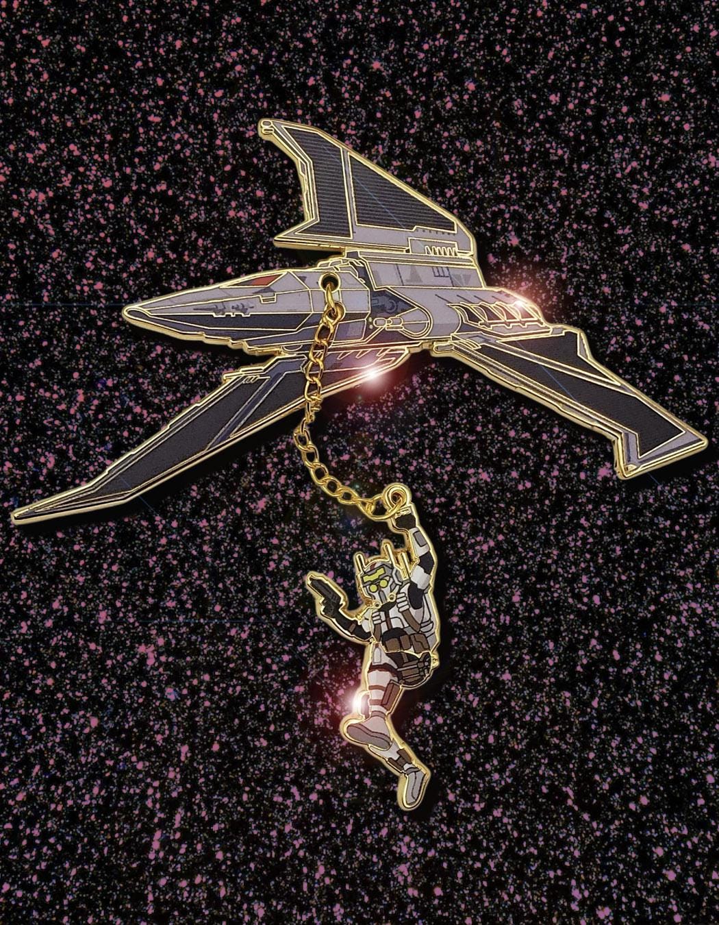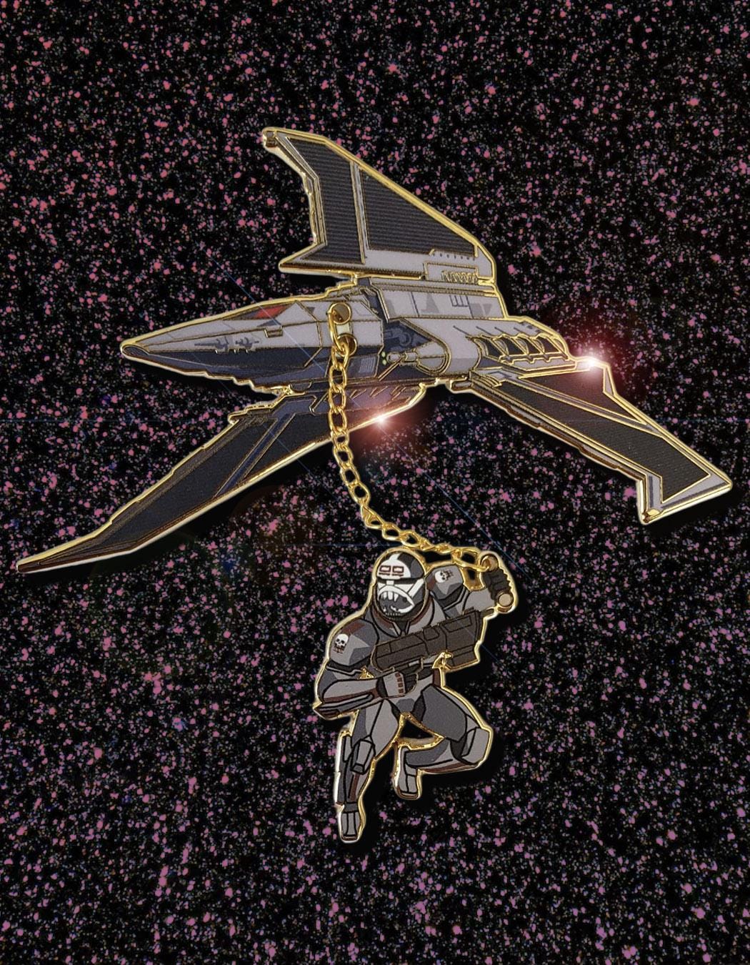The Havoc Marauder pin measures 3.5 inches across with screen printed details on hard enamel with polished nickel. It comes with 3 butterfly clasp pins on the back of the gunship for sturdy application. The figures have a pin back on it, so he can be positioned securely beneath the gunship. The figures measure 1.4 inches tall.