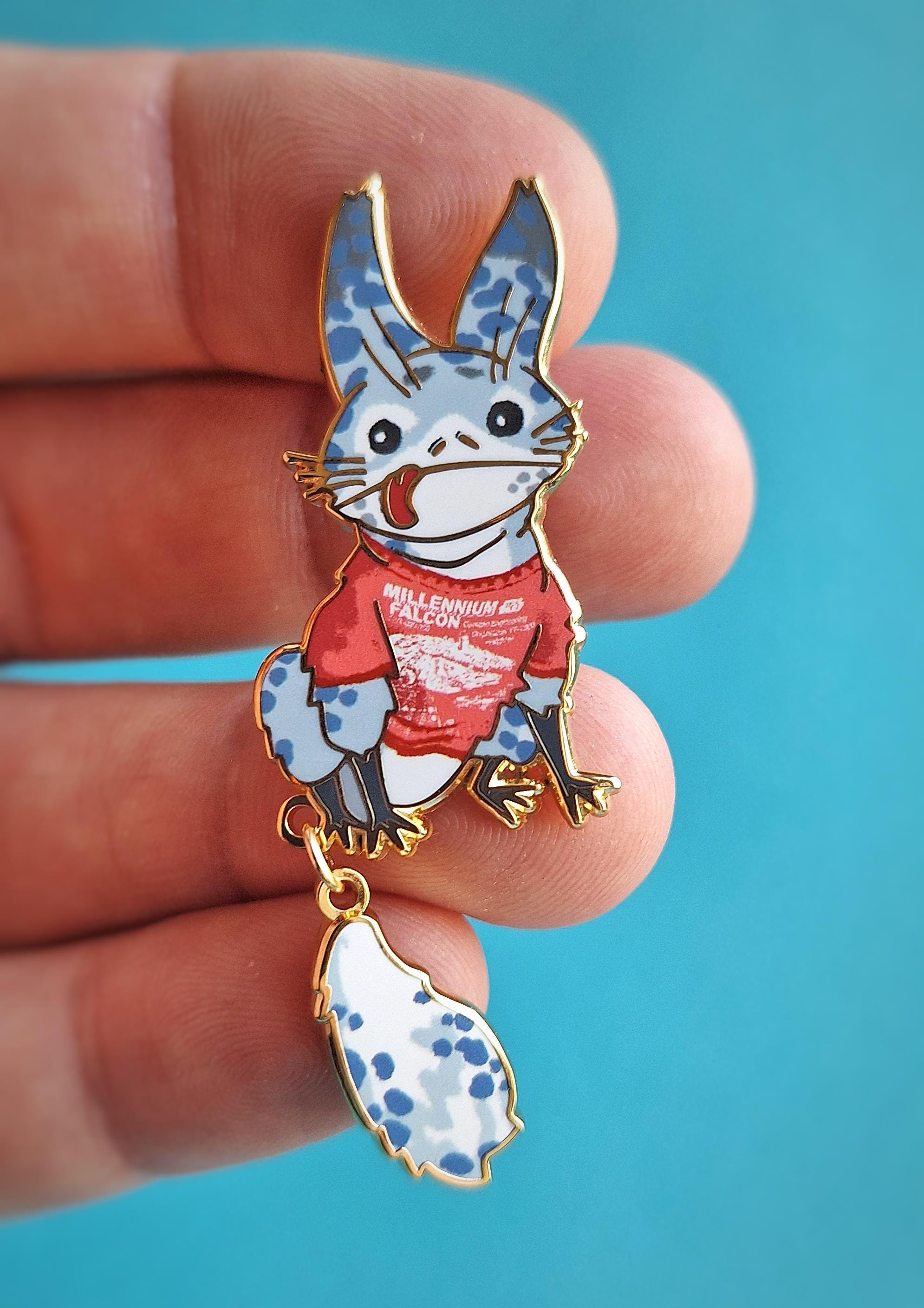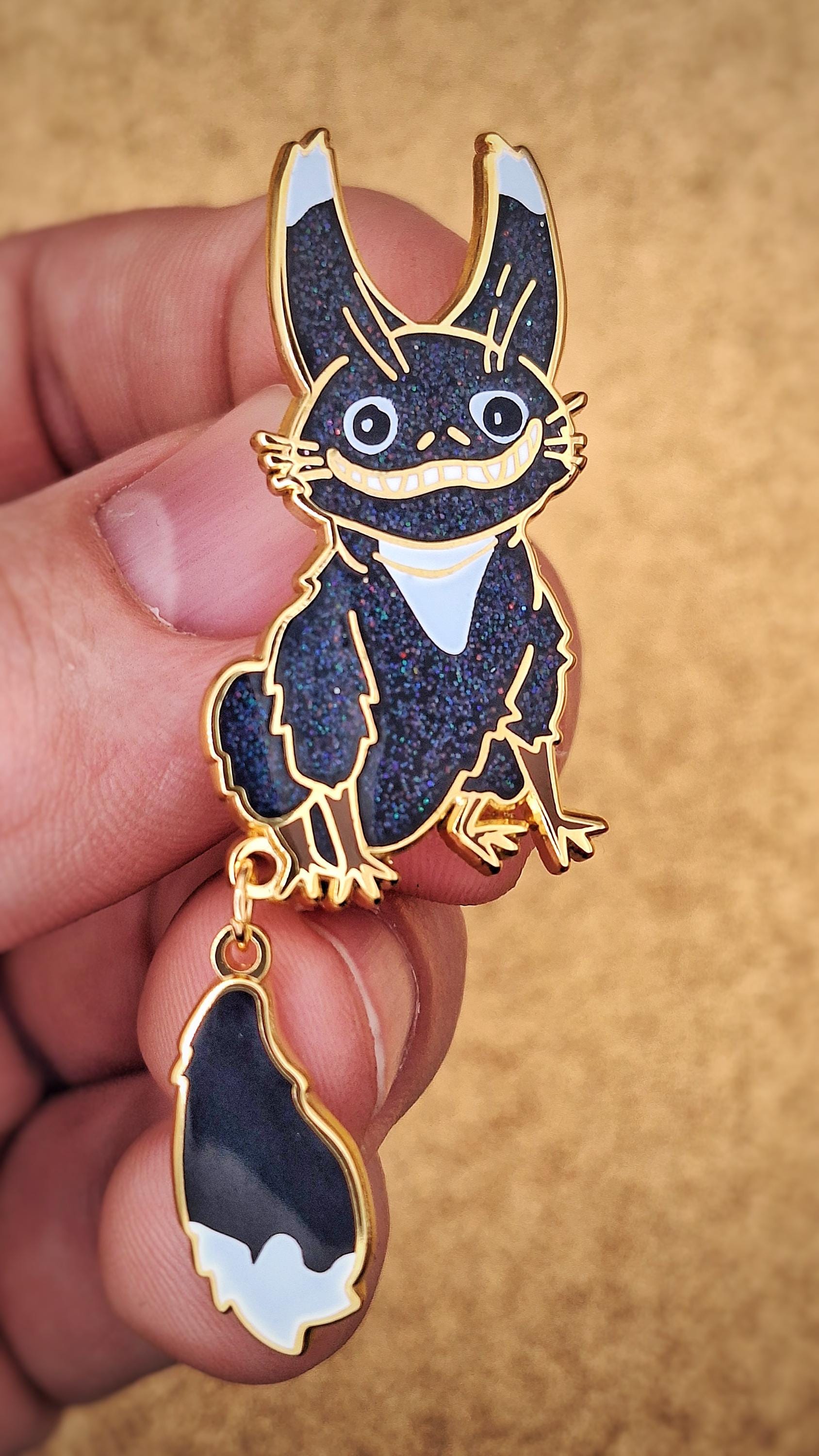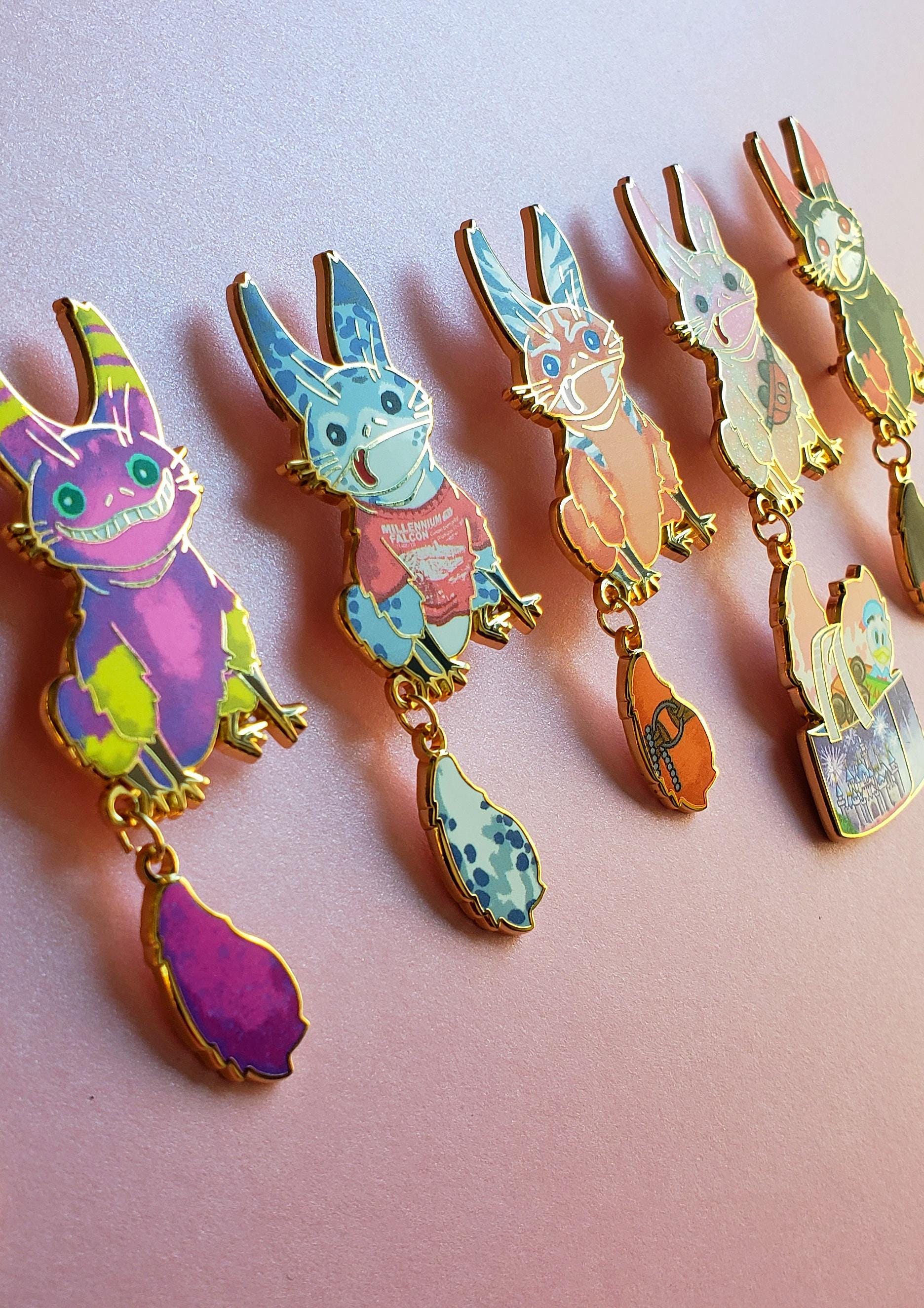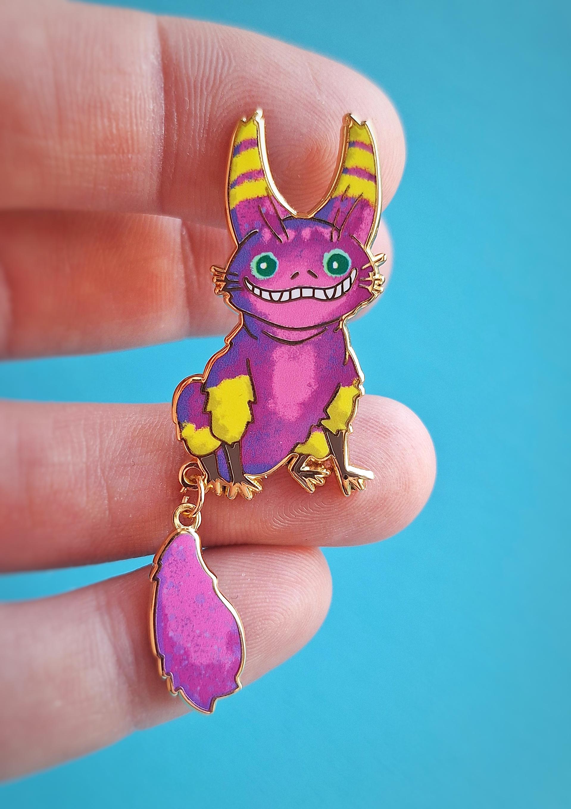 Each pin has 2 clasps on the back to keep it secure, but the tail does not so it can dangle freely. The pins are made of polished nickel with gold finish.