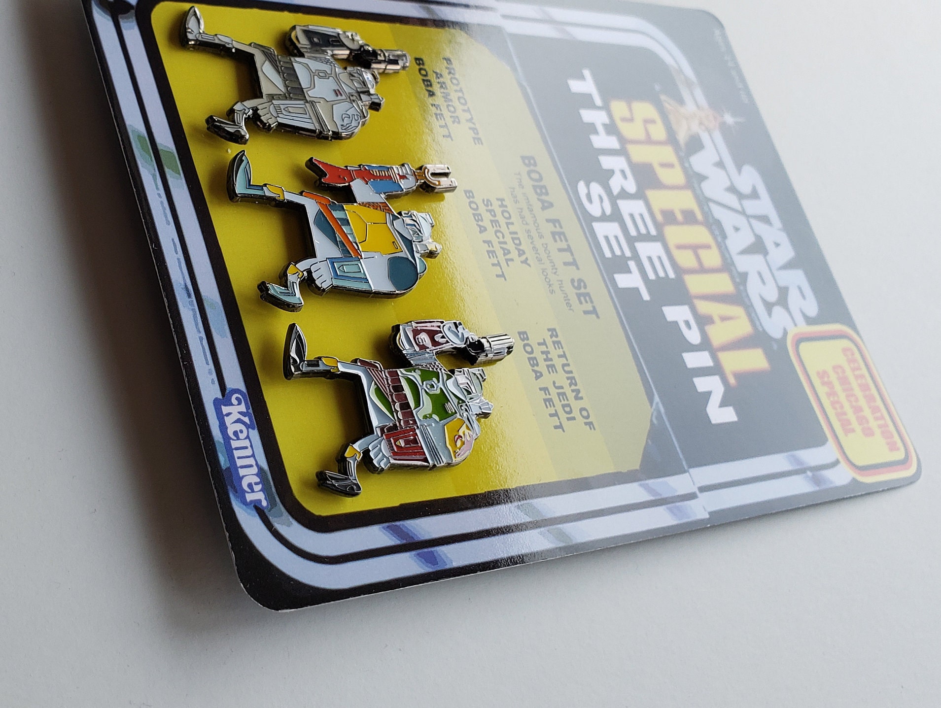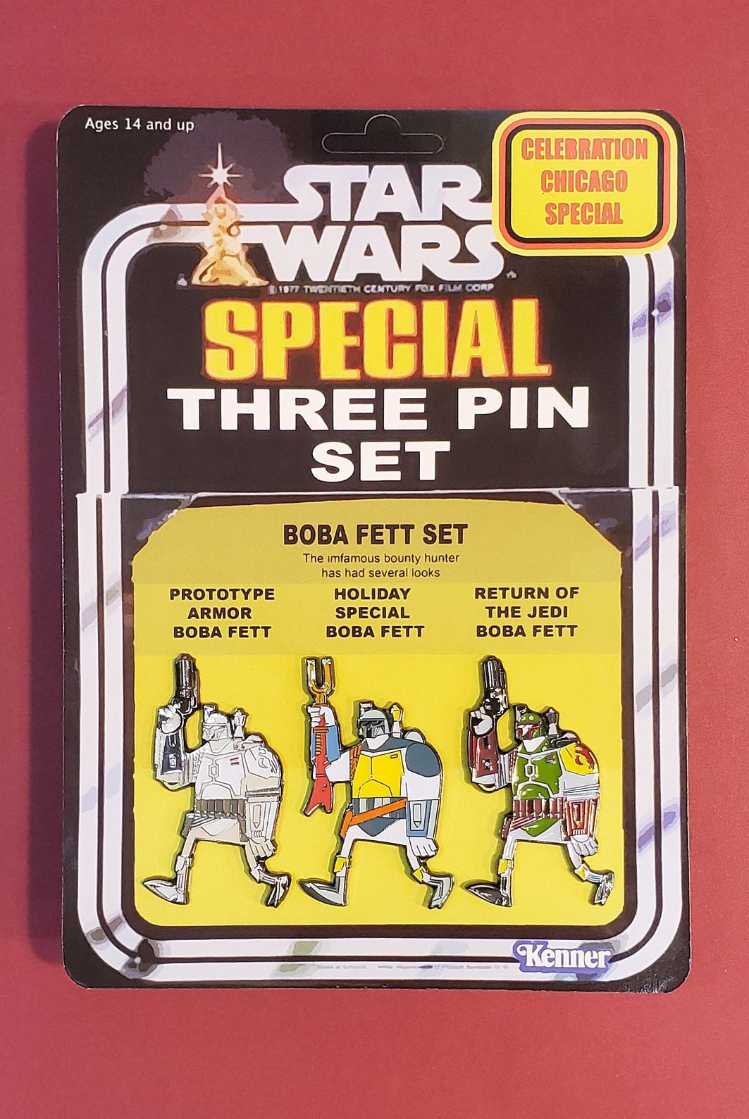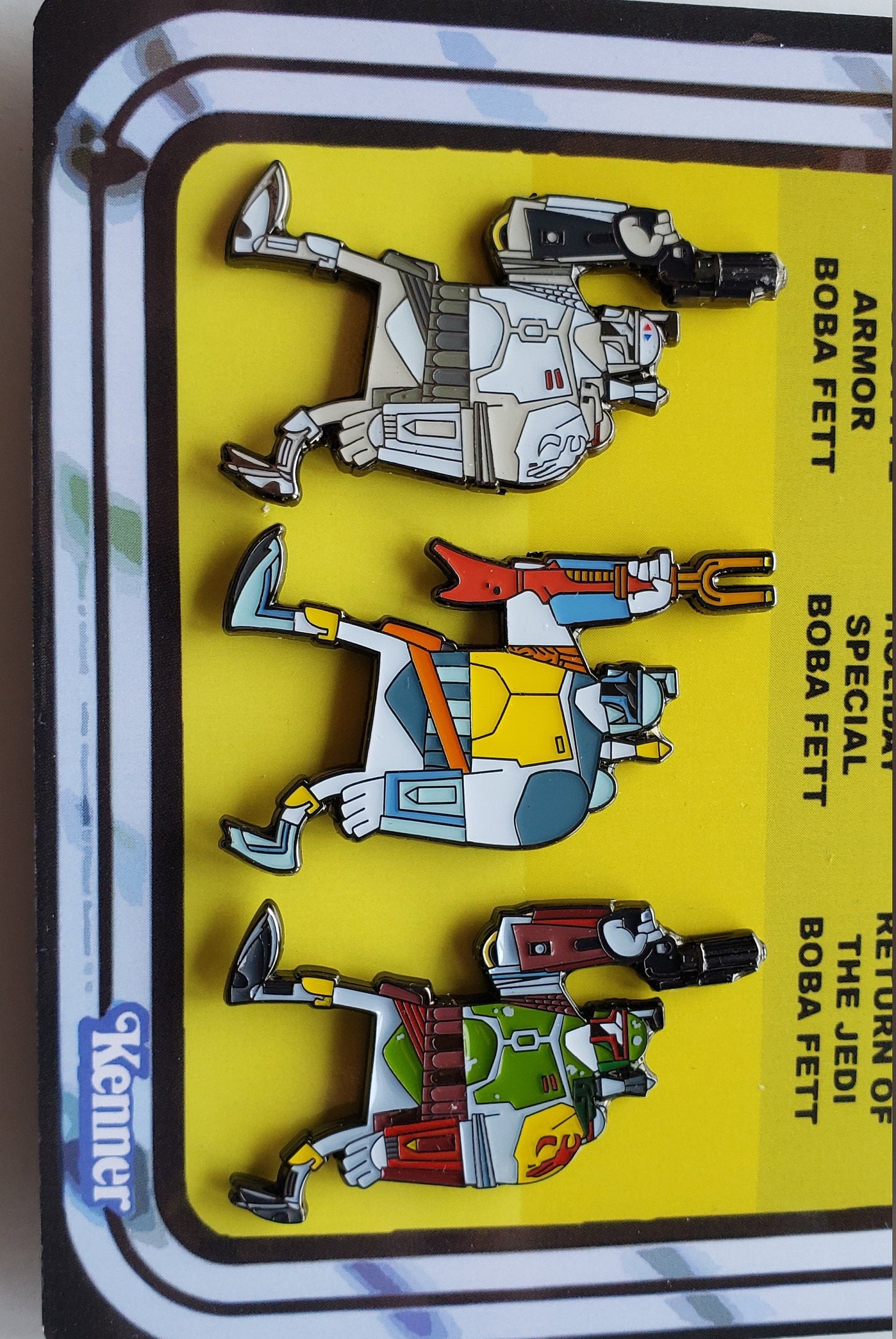 This amazing pin set features three versions of Boba Fett. You get the concept armor, the Holiday Special and the Return of the Jedi. It's enamel, celebrating one of the most classic action figures. This is version 2 of the pin where enamel was used instead of alloy making a beautiful sheen. And the guns have a 3-D effect to the barrel.