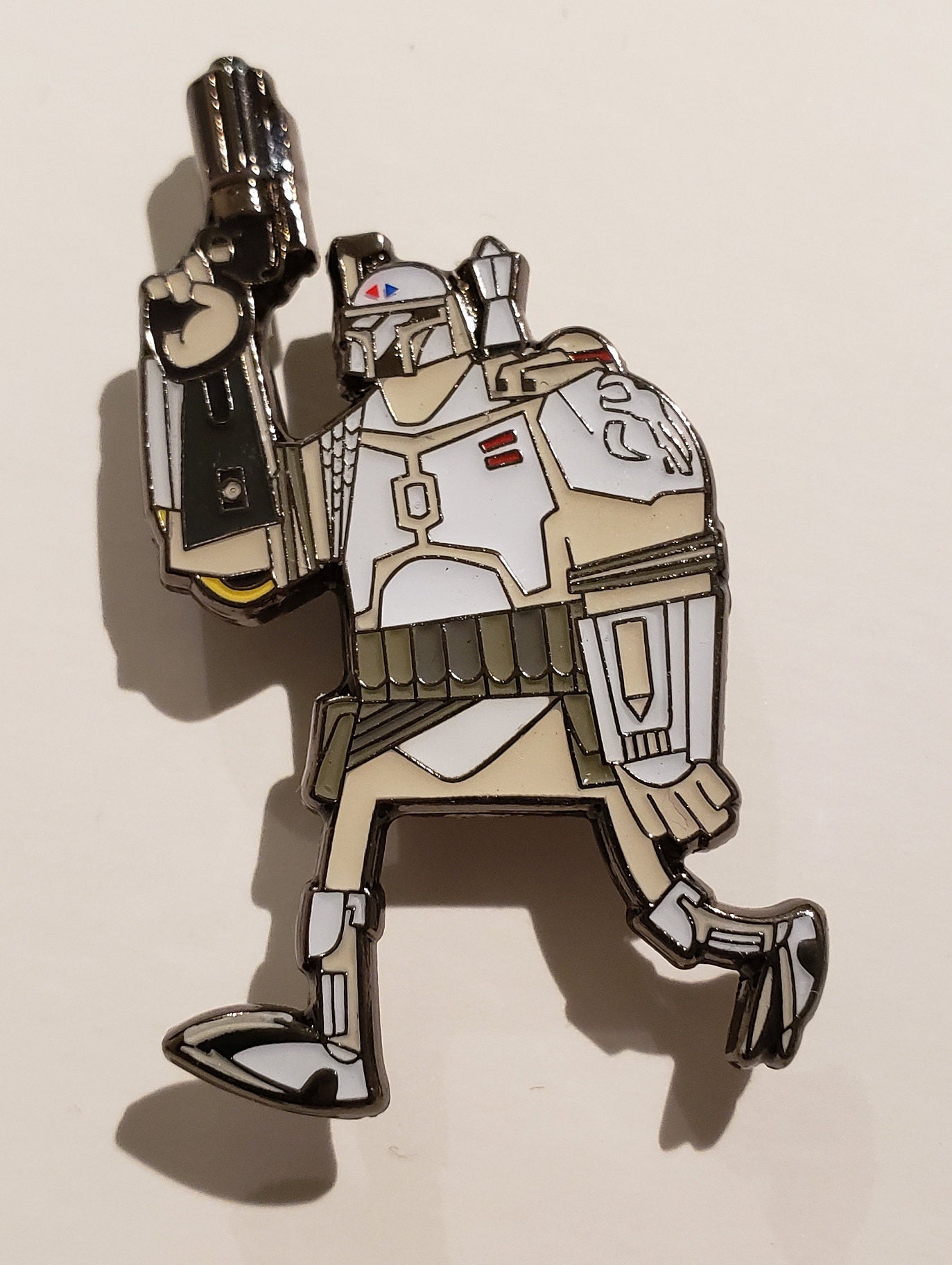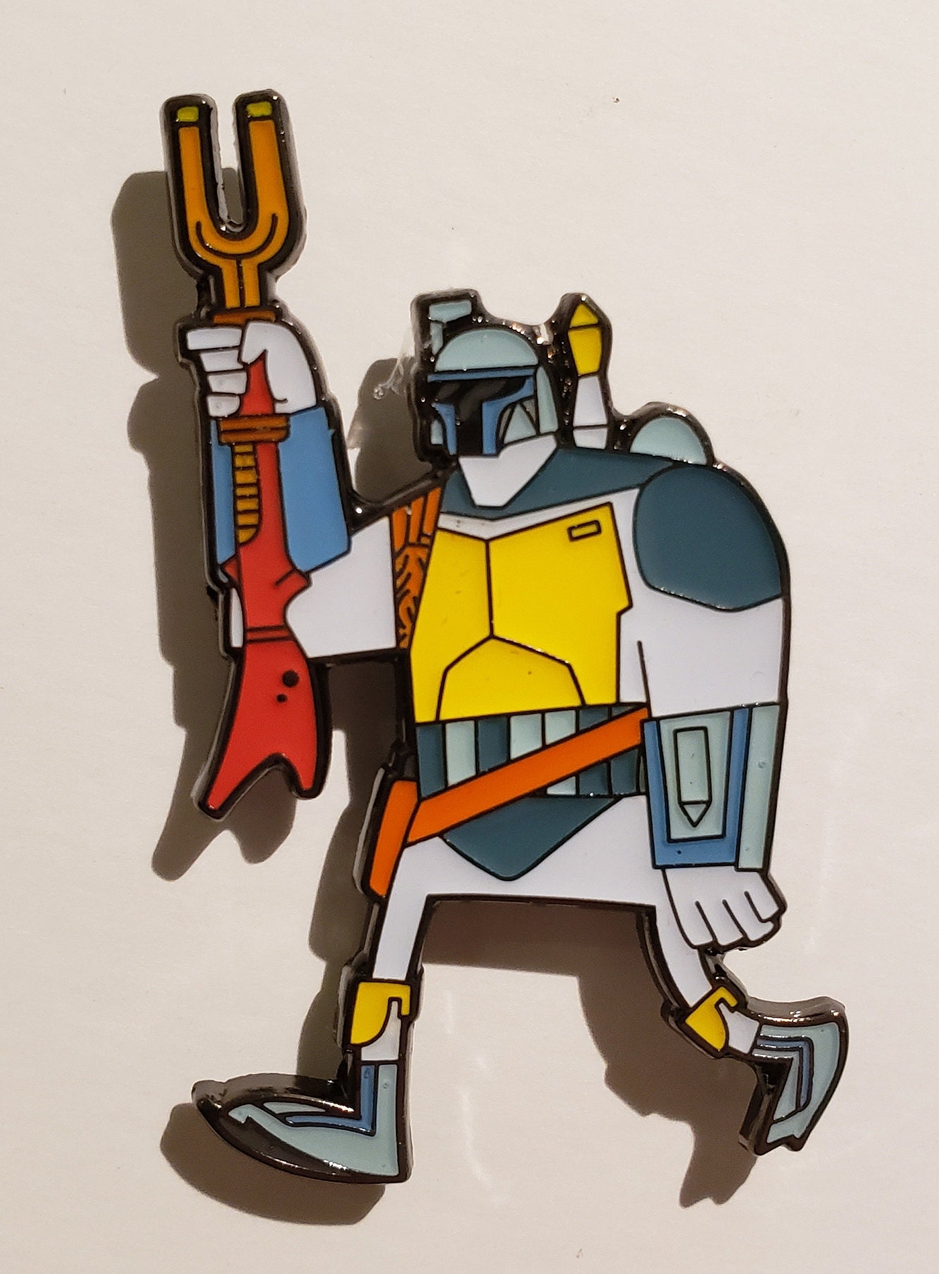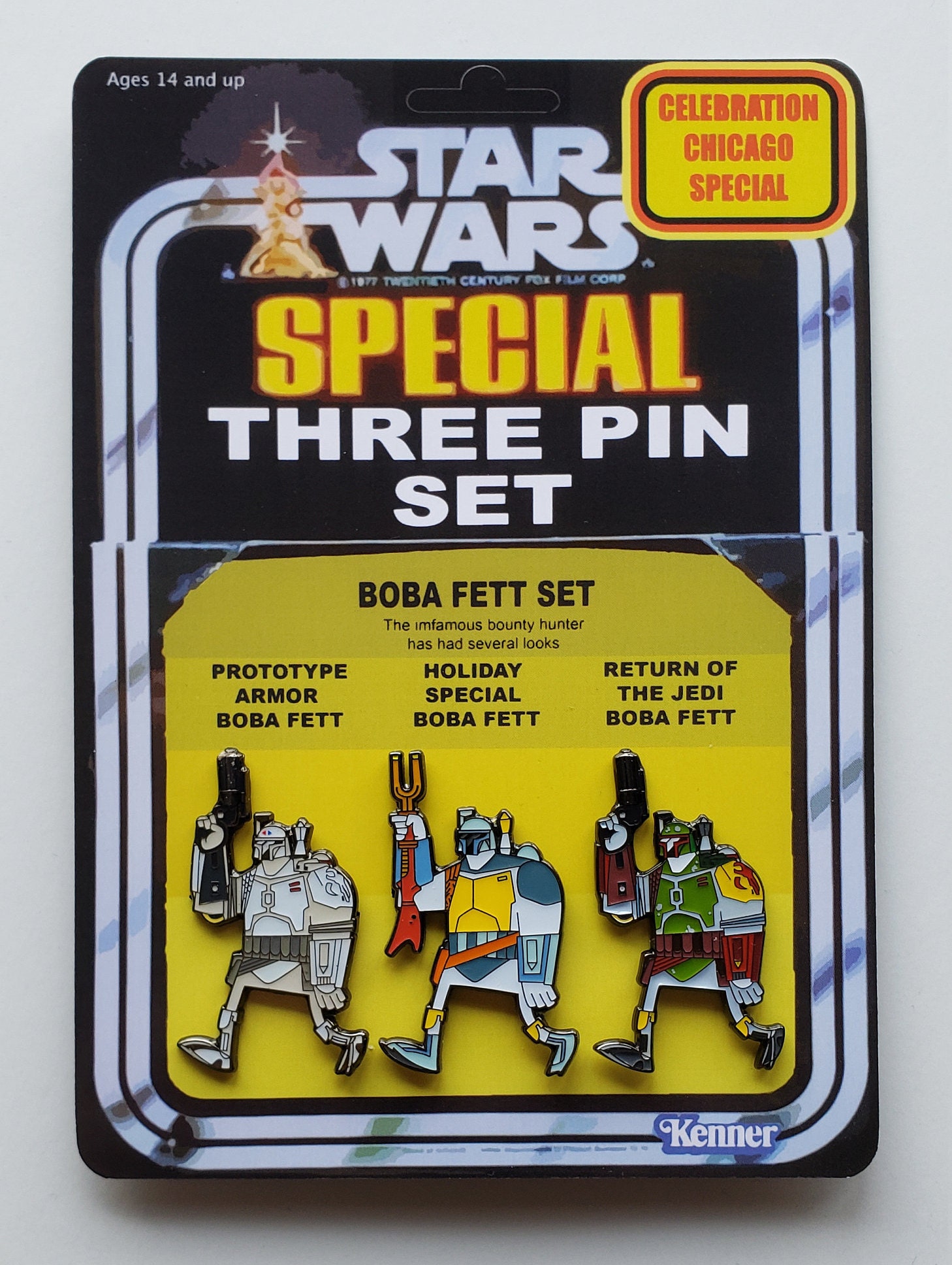This amazing pin set features three versions of Boba Fett. You get the concept armor, the Holiday Special and the Return of the Jedi. It's enamel, celebrating one of the most classic action figures. This is version 2 of the pin where enamel was used instead of alloy making a beautiful sheen. And the guns have a 3-D effect to the barrel.