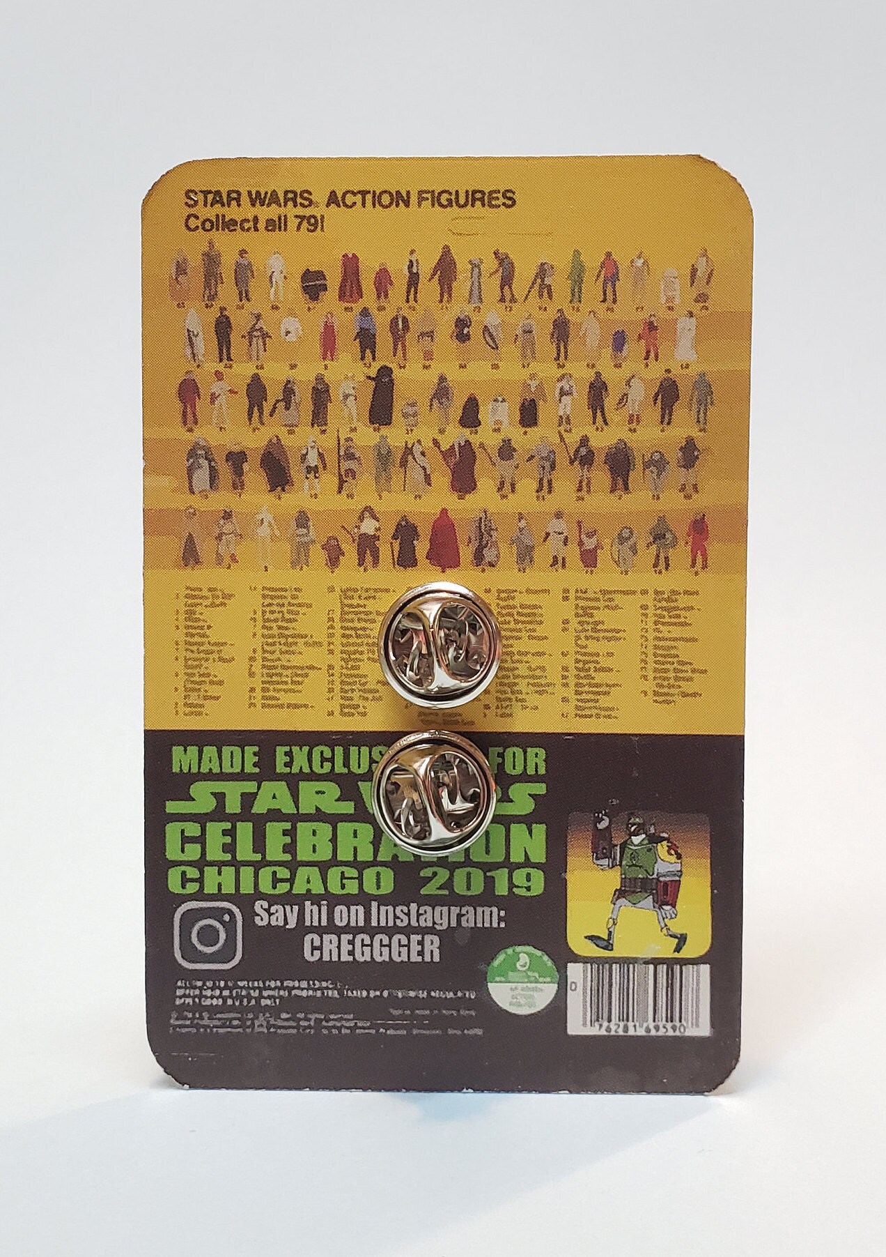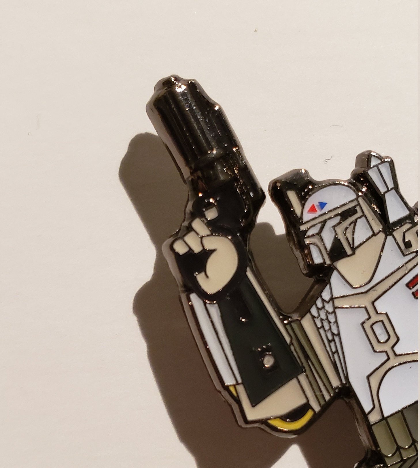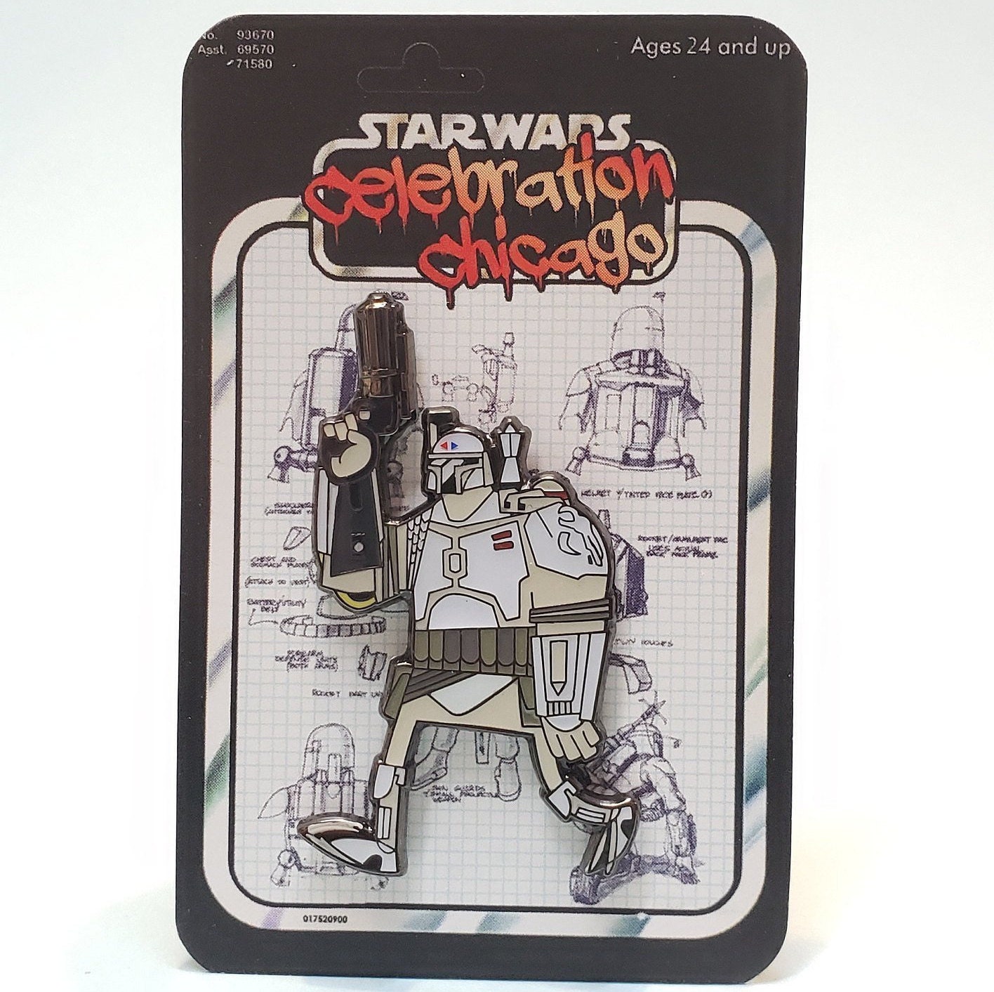 This amazing pin features the first concept outfit for Boba Fett. It's enamel and hard zinc pin celebrating one of the most classic action figures. This is version 2 of the pin where the gun is 3-D printed metal!